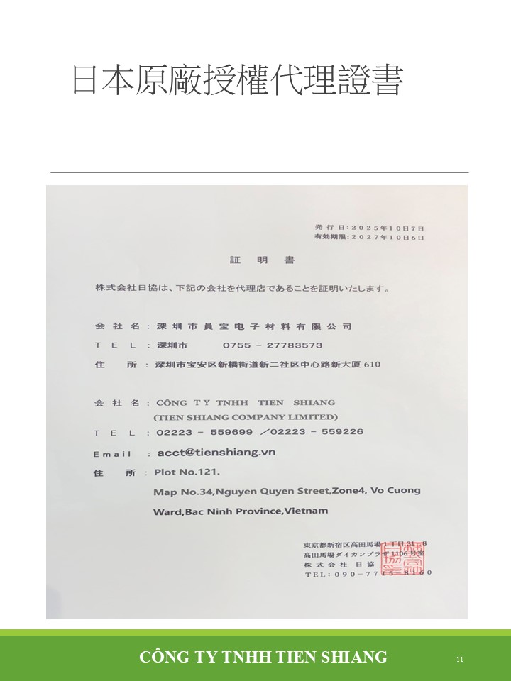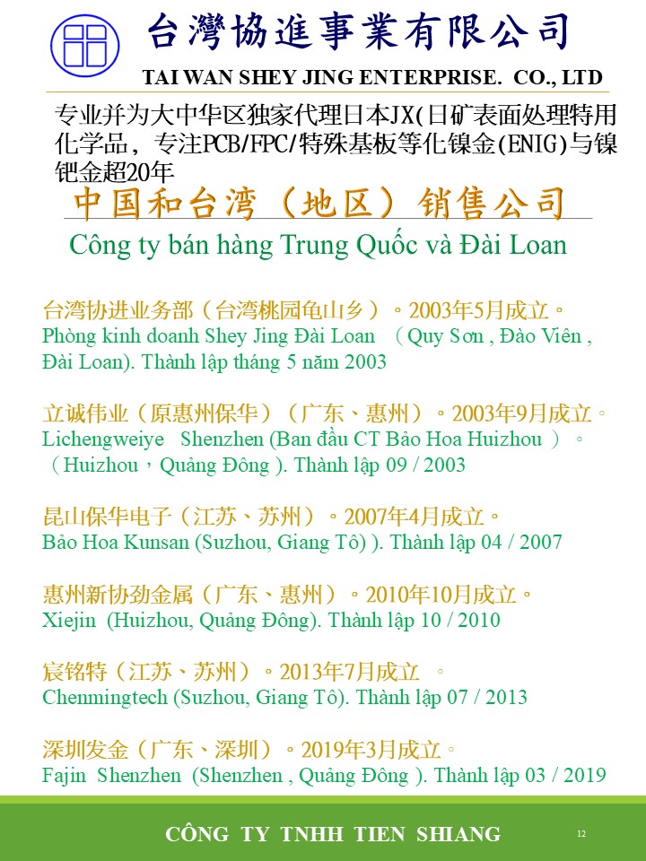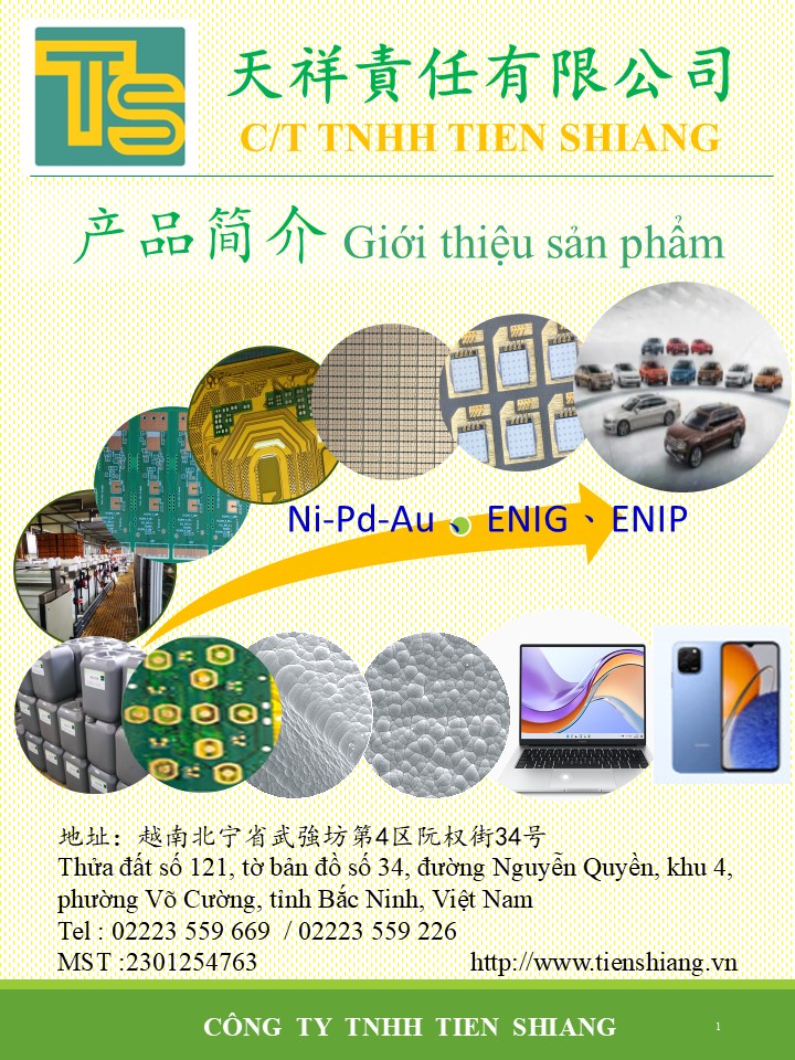 天祥责任有限公司成立于2023年8月,主要业务为代理日本 株式會社日協 特用化学品,应用于各类电路板(PCB/FPC)的无电解化学镍金(ENIG)、镍钯金(Ni-Pd-Au)以及镍钯(Ni-Pd)的表面处理。